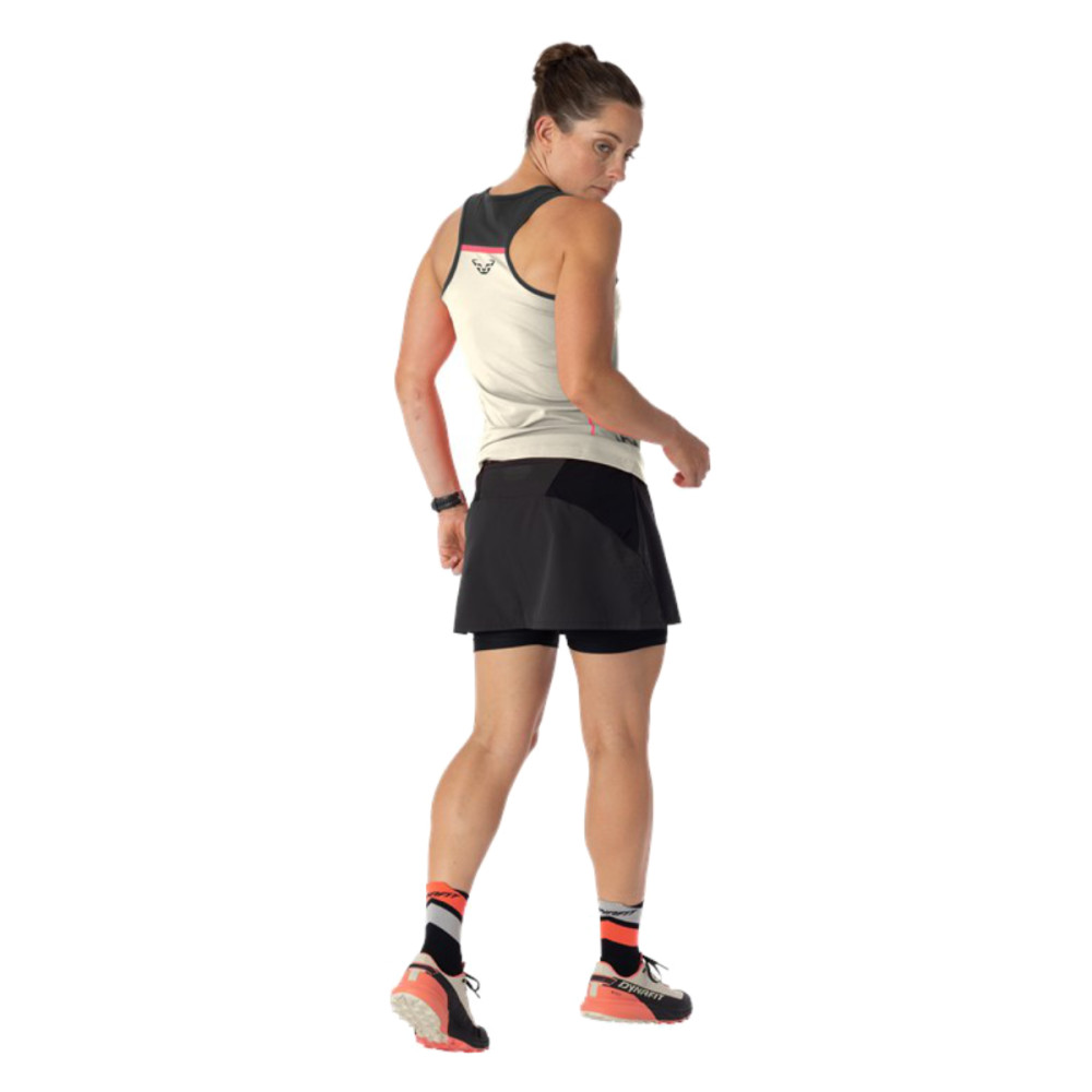 Běžecká sukně Alpine Pro 2in1 Skirt v sobě spojuje lehkost a volnost sukně s funkčností přiléhavých vnitřních kalhotek. Tato chytrá konstrukce zajišťuje maximální pohodlí i při dlouhých bězích nejen v horách. Vnitřní kraťasy s plochými švy spolehlivě odvádějí vlhkost a zabraňují tření v oblasti stehen. Lehká, recyklovaná tkanina sukně je prodyšná a příjemná na dotek, ideální i pro intenzivní běhy v horku.