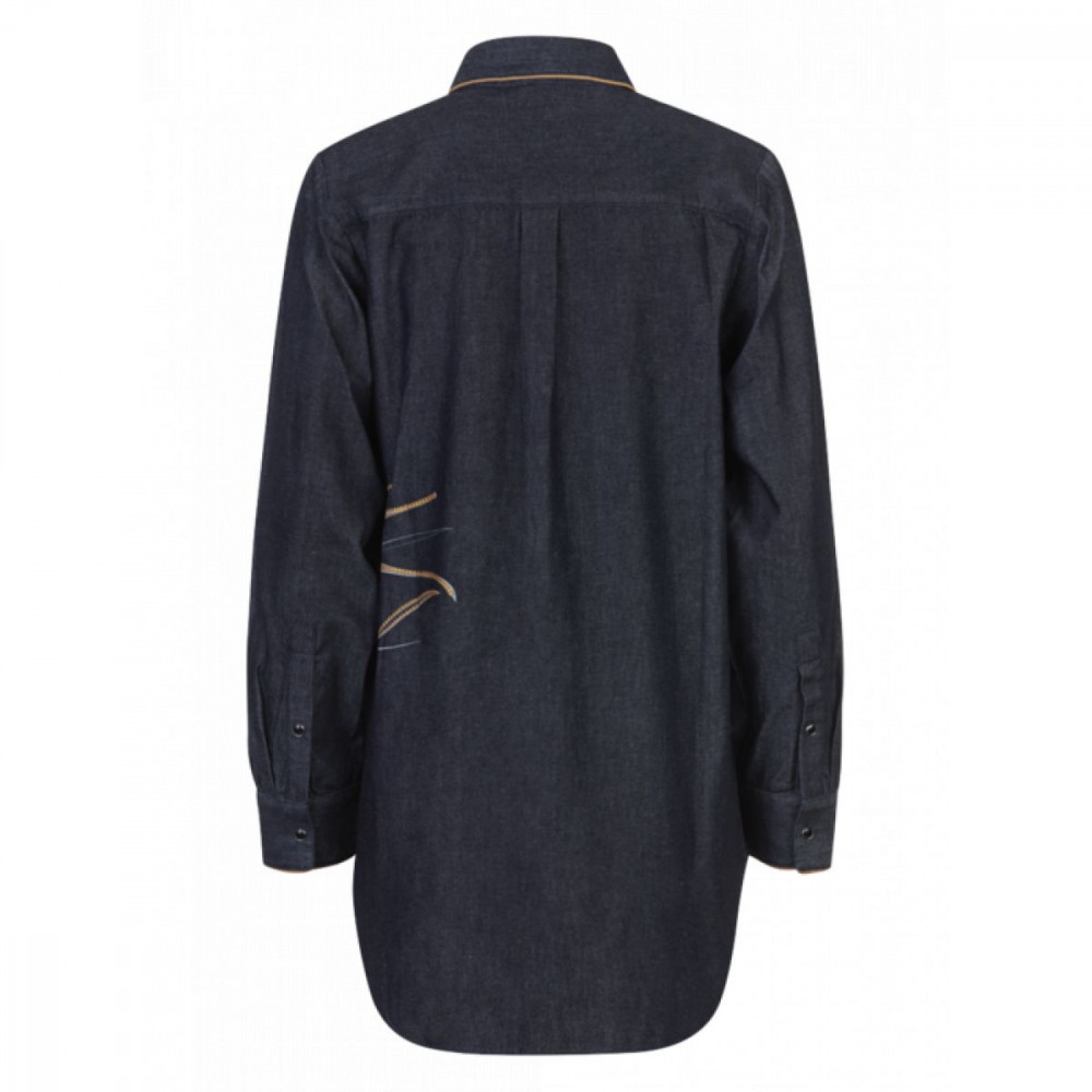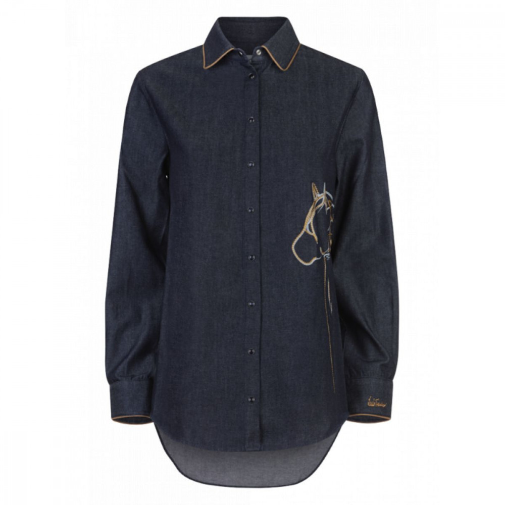 Dámská košile, která nesmí chybět v žádném šatníku! Košile je v tmavě džínové barvě a hlavním prvkem na košili je krásný hnědý vyšívaný kůň na boku. Košile má prodlouženou zadní stranu, oversize střih a zapínání na druky. Límeček a rukávy jsou ozvláštněné hnědým saténovým lemováním. Na rukávu je vyšitý nápis Luis Trenker. Košile má ojedinělý design a můžete ji tak kombinovat do různých stylů.