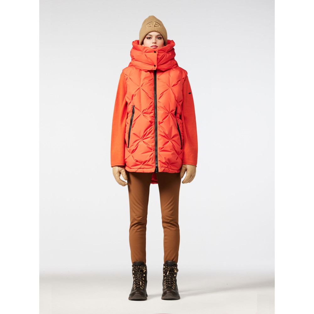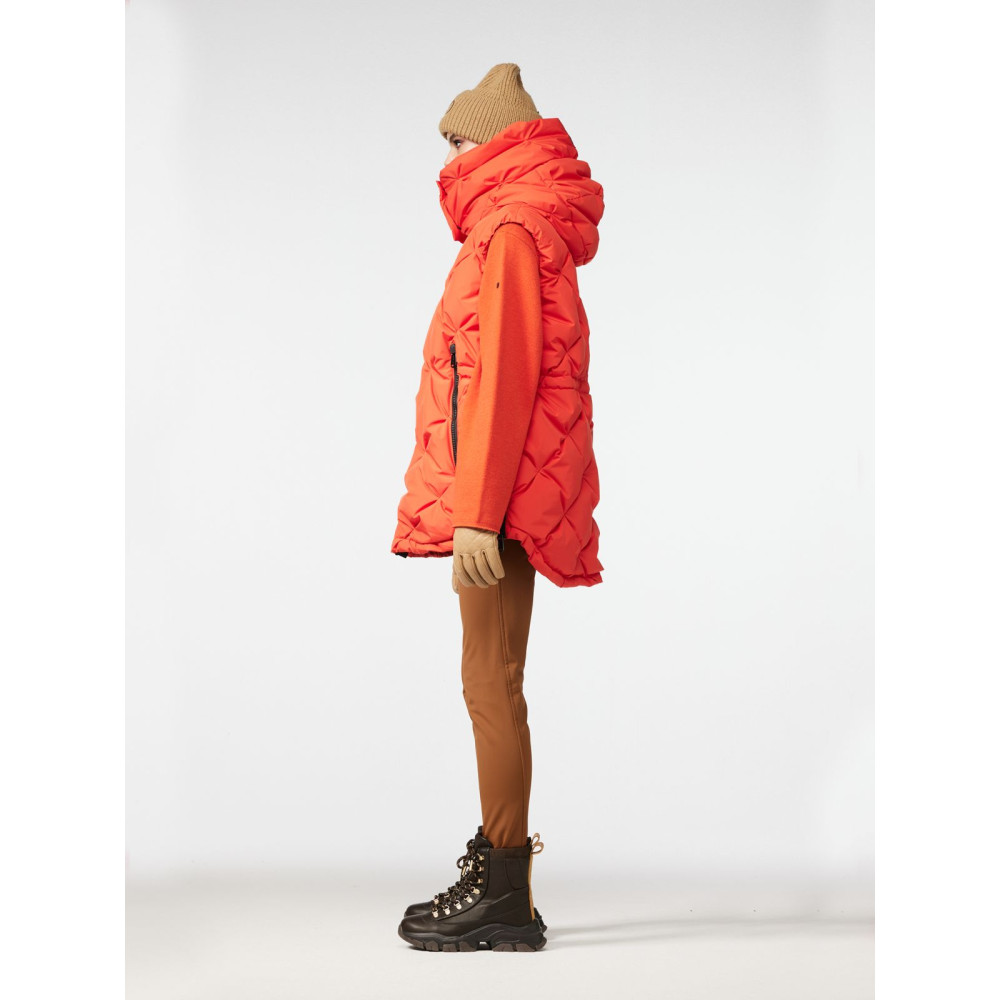 Vesta má volnější střih a zadní díl je mírně prodloužený. Vesta má vyvýšený stojáček, který se dá překrýt klopou a připnout pomocí druků. Na kapuci je plastické logo značky.