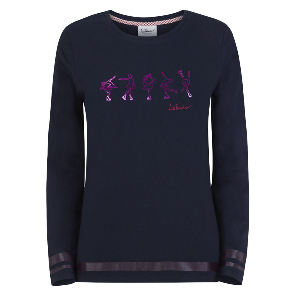 Dámské tričko, které ve vás probudí pravou krasobruslařku. Tmavě modré tričko je ozvláštněné růžovými potisky krasobruslařek v různých pózách. Pod motivem je vyšitý název značky. Spodní lem trička a rukávy jsou doplněné tmavě hnědými proužky. Díky materiálu je tričko velmi příjemné na dotek.