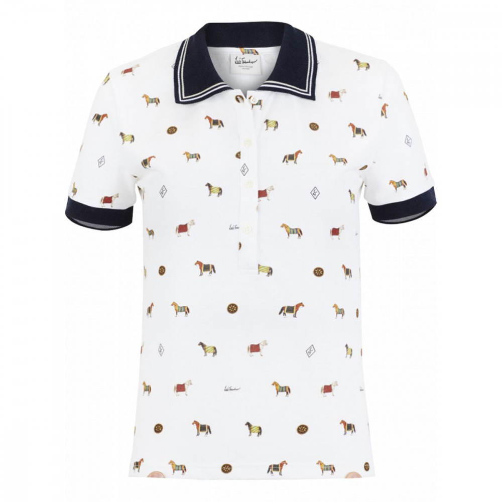 Dámské polo tričko s originálním motivem koní, které vám ihned padne do oka. Zapínání u krku je na knoflíky, límeček a rukávy jsou z tmavě modrého žebrovaného materiálu. Po bocích jsou malé rozparky, které vytvářejí mírně prodlouženou zadní stranu. Tričko je z příjemného a lehkého materiálu.