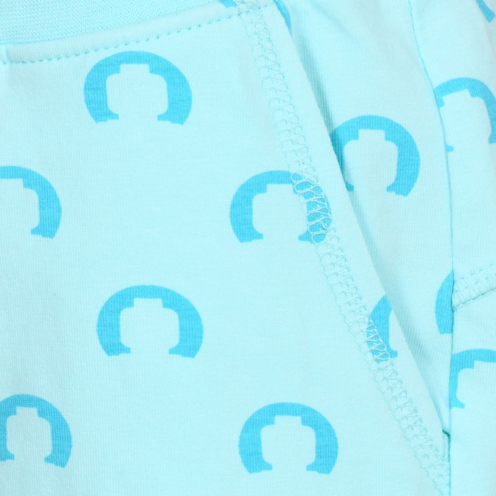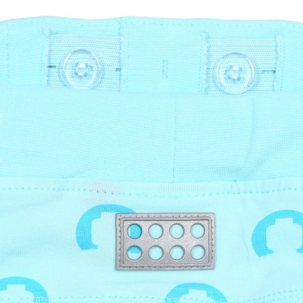 Jsou doplněné motivem hlav lego postaviček. Po bocích jsou malé rozparky. Z vnitřní strany v pase je elastická gumička a knoflík, který slouží k možnému stáhnutí. Na zadní straně je reflexní nášivka lego kostičky.