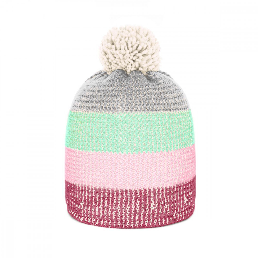 Dětská pruhovaná čepice, která je velmi příjemná na dotek. Má bílou bambuli a na přední straně je logo značky. Vnitřek čepice je zateplen fleecem.