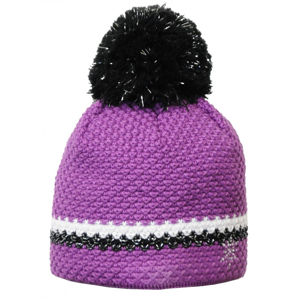 Fialová čepice s hvězdičkou s kamínků, kterou si zamiluje každá holčička. Po celém obvodu je černo-bílý pruh. Vnitřní strana je z části zateplená fleecem. Proužky a bambule jsou prošité stříbrným lurexem.