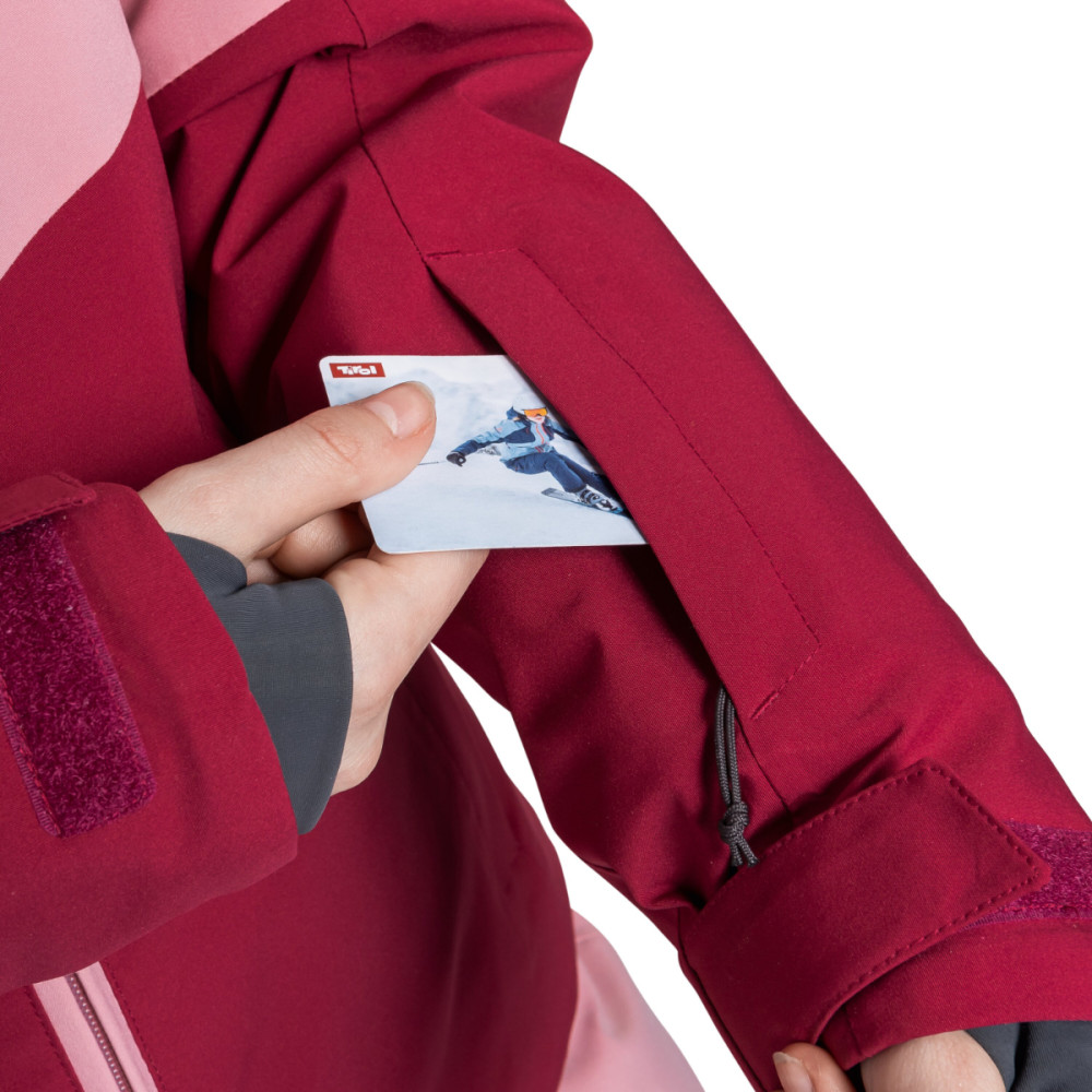 Kapuce a manžety na rukou jsou nastavitelné. Má praktickou kapsu na skipas, dvě vnější kapsy na zip a pevný sněhový pás se silikonovým páskem, který zabraňuje vniku sněhu do bundy.