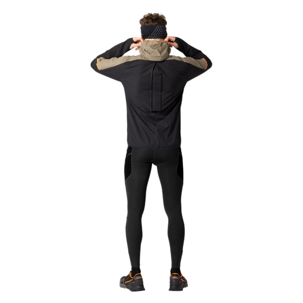 Ergonomický střih a pružný materiál zajišťují naprostou volnost pohybu, zatímco perforace v podpaží se stará o vyšší prodyšnost. Zvýšený objem v oblasti zad umožňuje pohodlné obléknutí bundy i přes běžeckou vestu. Při vysoké zátěži lze bundu zcela rozepnout a díky důmyslnému drukovému zapínání na hrudi drží na svém místě, aniž by vás omezovala. Kapuci lze srolovat a zajistit, když ji zrovna nepotřebujete.