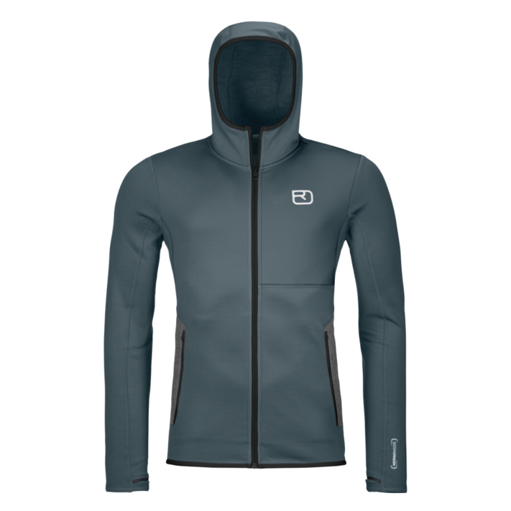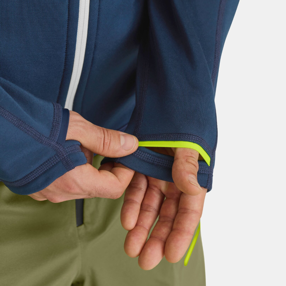 Merino vlna na vnitřní straně je na pokožce velmi příjemná, neutralizuje zápachy a zajišťuje přirozenou regulaci vlhkosti i teploty. Na vnější straně je recyklovaný polyester, který dodává mikině odolnost a prodyšnost. Na konci rukávů jsou otvory na palce. Kolem kapes je detail šedého vlněného materiálu, který dodává mikině ojedinělý design. Na zádech a hrudníku jsou bílé loga značky.
