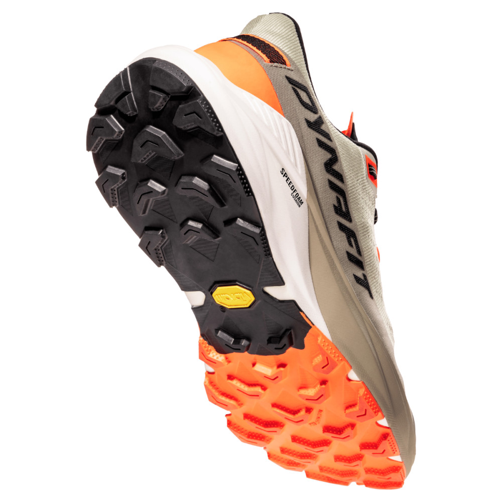 Podešev Vibram® Megagrip s technologií Traction Lug poskytuje vynikající přilnavost na suchém i mokrém povrchu. Prodyšný pletený svršek s podílem 38,8 % recyklovaných materiálů pomáhá udržet chodidla v komfortu i při dlouhých bězích. Ploché tkaničky zajišťují stabilní fixaci chodidla bez nepříjemných tlakových bodů. Konstrukce boty je navíc vyrobena bez použití živočišných materiálů.